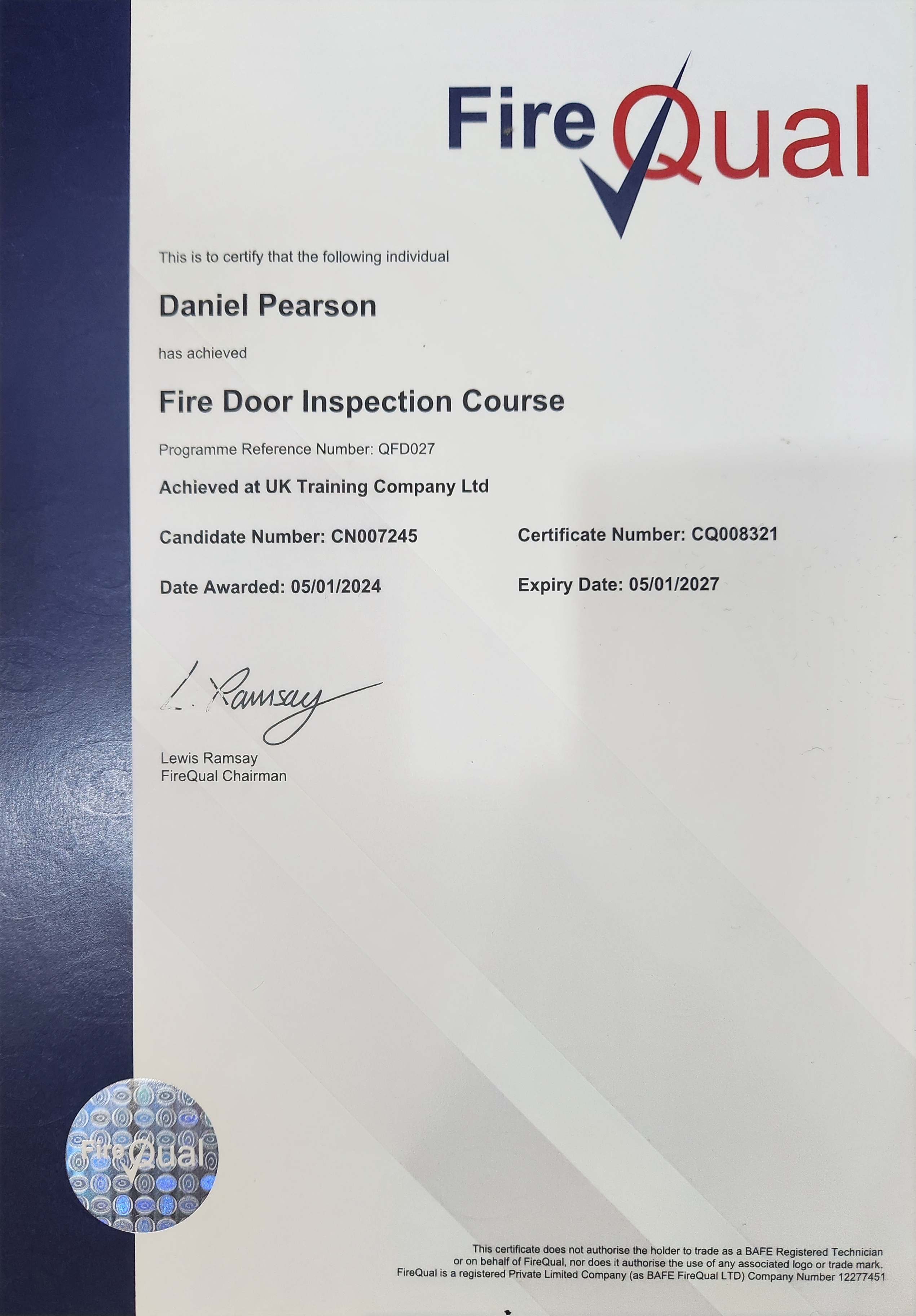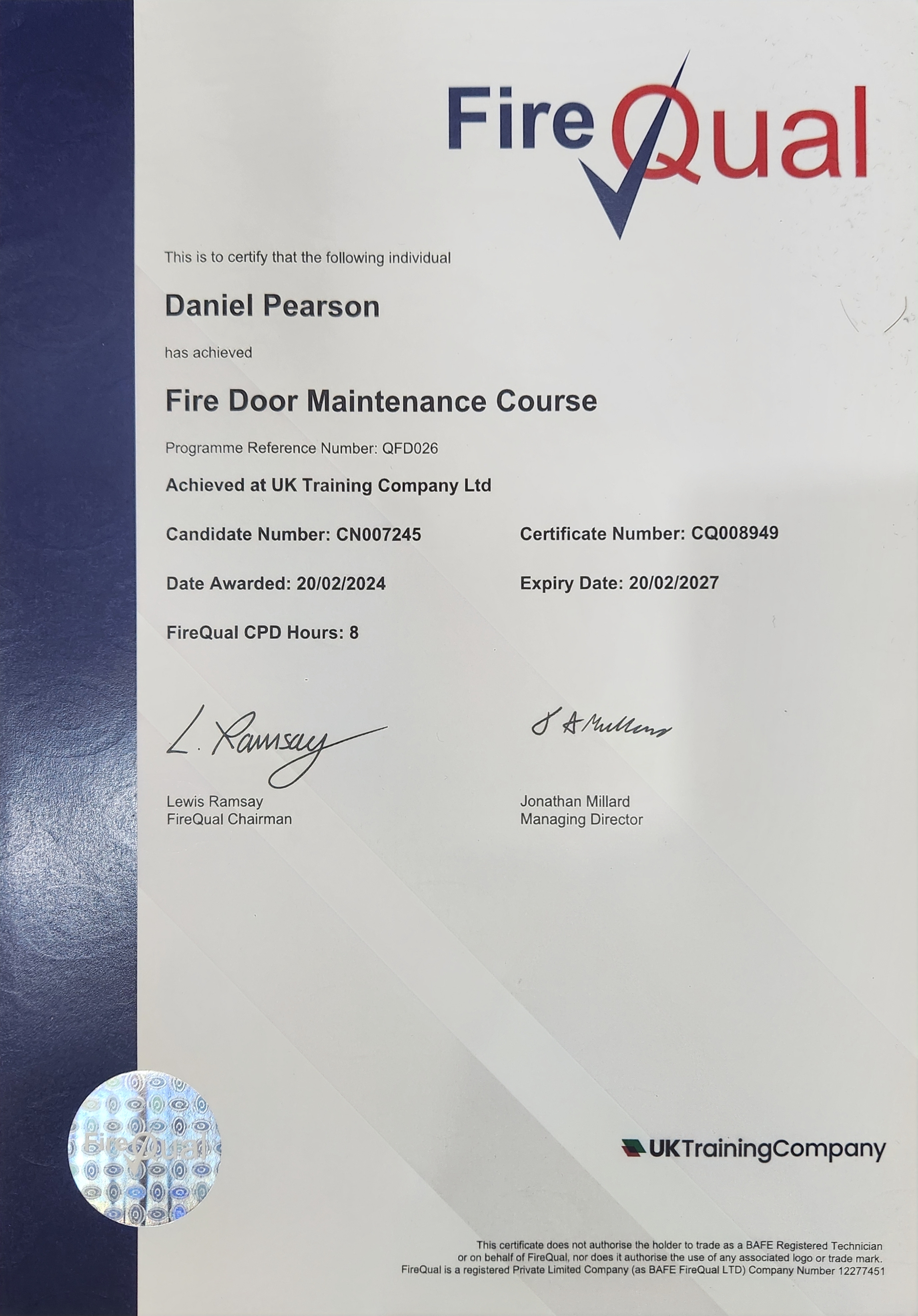 Our rapid response and attention to detail ensure that your premises are secured with fully functioning fire doors, maintaining the highest standards of fire safety. In the event of unexpected damage or faults, Pearson Fire Door Services LTD offers emergency fire door repair services. Understanding the urgency of such situations, we are committed to providing rapid and effective solutions to secure your premises. Our emergency repair service is available at a competitive rate of £199 plus VAT, ensuring your fire doors are promptly restored to their optimal condition without compromising on safety or quality. Trust us to be there when you need us the most, with the expertise and readiness to address any emergency repair needs.